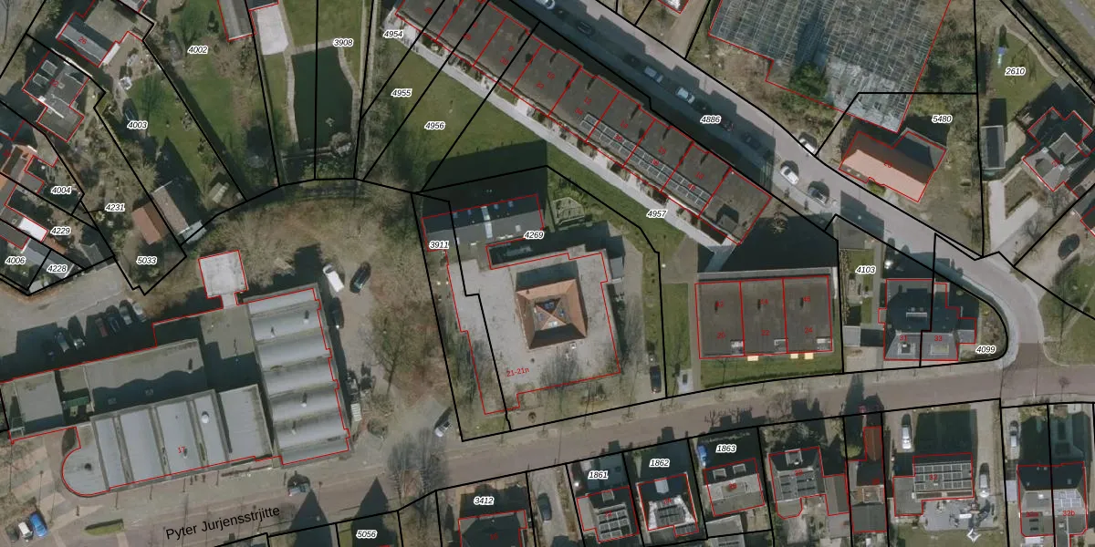 Pyter Jurjensstrjitte 21-d is gelegen op kadastraal perceel HUM00B4269. Deze kadastrale aanduiding is uniek en wordt gebruikt door het Kadaster om eigendomsrechten en andere zakelijke rechten vast te leggen. Het perceel maakt onderdeel uit van de kadastrale gemeente Hijum.