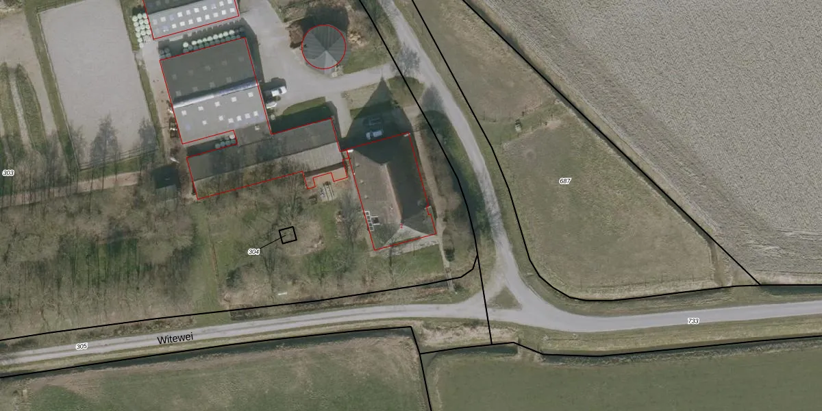 Het perceel waarop Witewei 2 staat heeft een oppervlakte van 1,5 ha. Dit is een zeer groot perceel. De perceeloppervlakte wordt geregistreerd door het Kadaster. Gedetailleerde informatie over de maten van dit perceel kunt u vinden in het rapport Kadastrale kaart met maatvoering van Witewei 2.