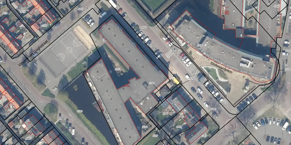 Het adres is gelegen op perceel 5251 in de sectie D en de kadastrale gemeente Stolwijk. De kadastrale aanduiding is aldus SWK02-D-5251. Het perceel is kleiner dan gemiddeld in Stolwijk. Het perceel is 3022 m² groot, terwijl het gemiddelde ligt op 4602,99 m². Het grootste perceel in de kadastrale gemeente is 34,2 ha. Het kleinste perceel heeft een oppervlakte van 0 m². Er zijn 44 adressen aanwezig op het perceel. De huidige grenzen van het perceel zijn digitaal in de Basisregistratie Kadaster (BRK) geregistreerd op 02-02-2006.