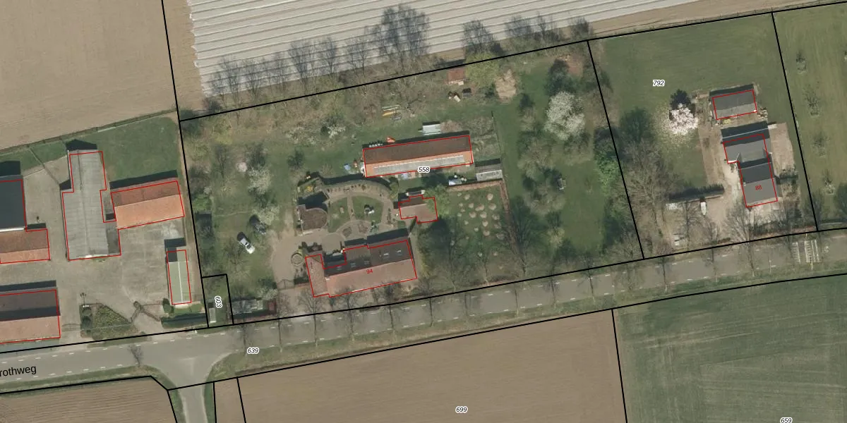 Het adres is gelegen op perceel 558 in de sectie G en de kadastrale gemeente Stramproy. De kadastrale aanduiding is aldus SRY00-G-558. Het perceel is met 5179 m² relatief groot. Het gemiddelde ligt in de kadastrale gemeente Stramproy op 3051,39 m². De grootste perceeloppervlakte in de kadastrale gemeente is 12,0 ha. De kleinste oppervlakte bedraagt 0 m². Er zijn 3 adressen aanwezig op het perceel. De huidige grenzen van het perceel zijn digitaal in de Basisregistratie Kadaster (BRK) geregistreerd op 17-10-2022.