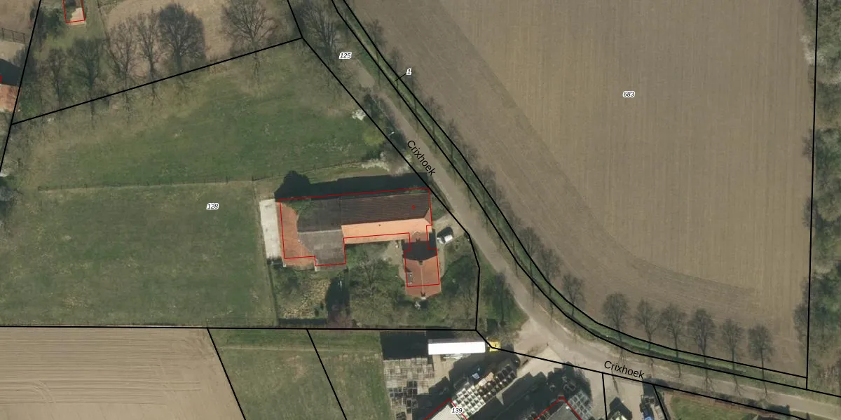 Het perceel waarop Crixhoek 8 staat heeft een oppervlakte van 6202 m². Dit is een zeer groot perceel. De perceeloppervlakte wordt geregistreerd door het Kadaster. Gedetailleerde informatie over de maten van dit perceel kunt u vinden in het rapport Kadastrale kaart met maatvoering van Crixhoek 8.
