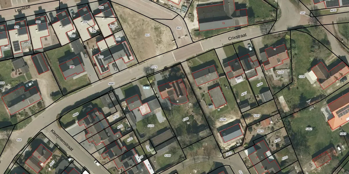 Het perceel waarop Crixstraat 9 staat heeft een oppervlakte van 920 m². Dit is een groot perceel. De perceeloppervlakte wordt geregistreerd door het Kadaster. Gedetailleerde informatie over de maten van dit perceel kunt u vinden in het rapport Kadastrale kaart met maatvoering van Crixstraat 9.