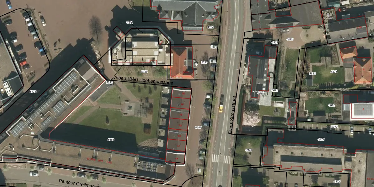 Frans Strouxstraat 4-D is gelegen op kadastraal perceel SRY00D5688. Deze kadastrale aanduiding is uniek en wordt gebruikt door het Kadaster om eigendomsrechten en andere zakelijke rechten vast te leggen. Het perceel maakt onderdeel uit van de kadastrale gemeente Stramproy.