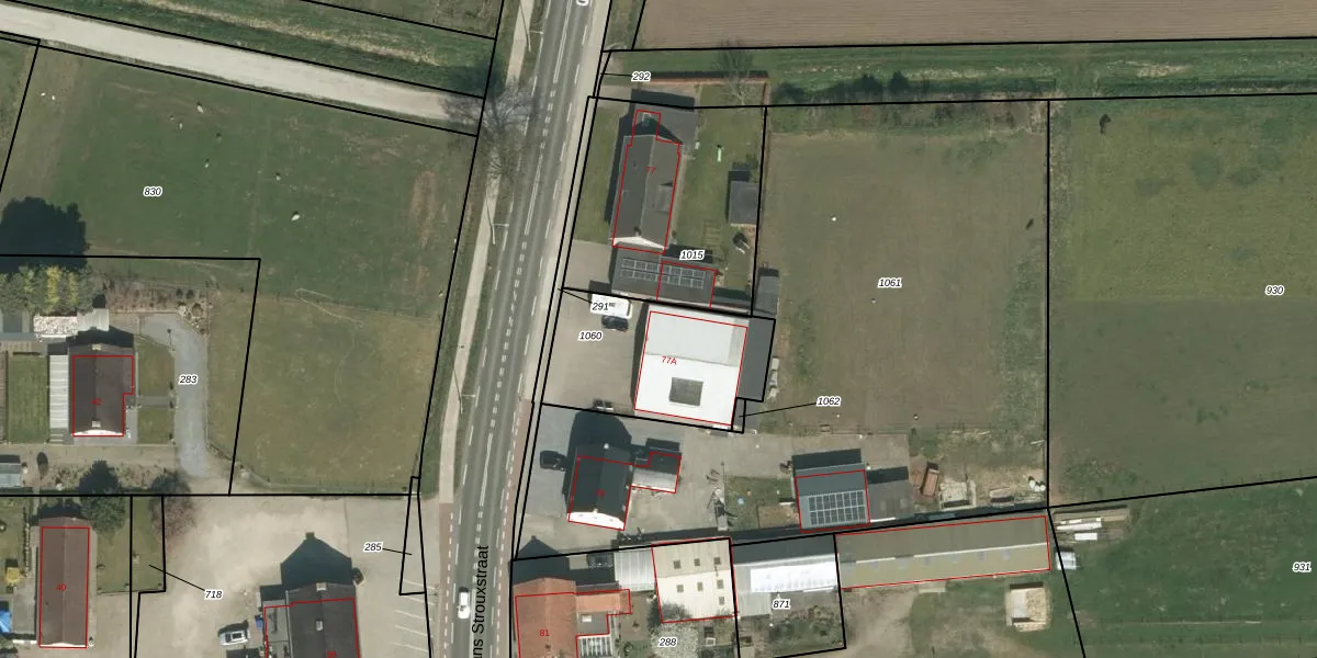 Frans Strouxstraat 77-A is gelegen op kadastraal perceel SRY00F1060. Deze kadastrale aanduiding is uniek en wordt gebruikt door het Kadaster om eigendomsrechten en andere zakelijke rechten vast te leggen. Het perceel maakt onderdeel uit van de kadastrale gemeente Stramproy.
