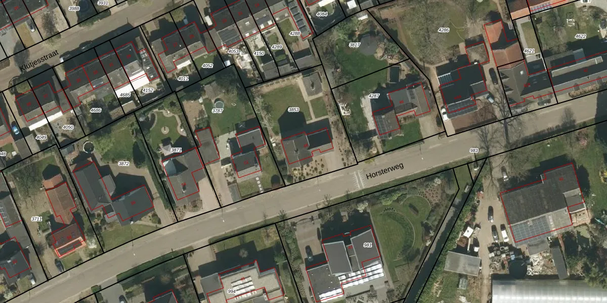 Het perceel waarop Horsterweg 48 staat heeft een oppervlakte van 905 m². Dit is een groot perceel. De perceeloppervlakte wordt geregistreerd door het Kadaster. Gedetailleerde informatie over de maten van dit perceel kunt u vinden in het rapport Kadastrale kaart met maatvoering van Horsterweg 48.