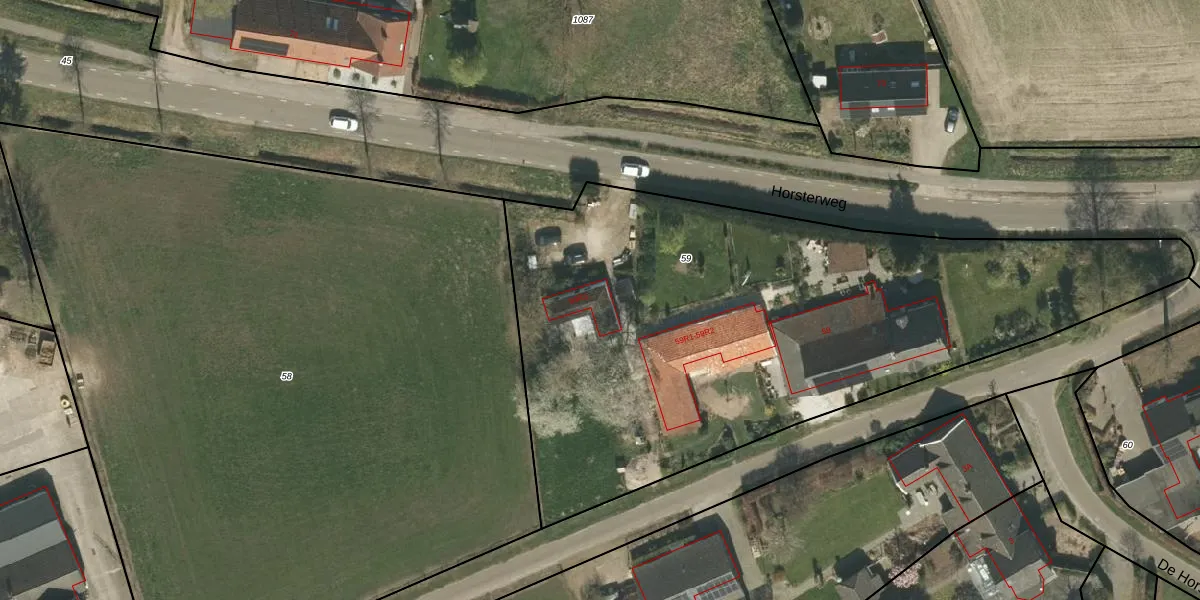 Het perceel waarop Horsterweg 59-R3 staat heeft een oppervlakte van 3404 m². Dit is een zeer groot perceel. De perceeloppervlakte wordt geregistreerd door het Kadaster. Gedetailleerde informatie over de maten van dit perceel kunt u vinden in het rapport Kadastrale kaart met maatvoering van Horsterweg 59-R3.