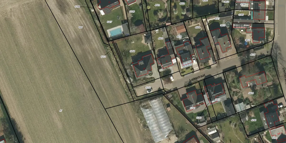 Leitsstraat 10 is gelegen op kadastraal perceel SRY00D5054. Deze kadastrale aanduiding is uniek en wordt gebruikt door het Kadaster om eigendomsrechten en andere zakelijke rechten vast te leggen. Het perceel maakt onderdeel uit van de kadastrale gemeente Stramproy.