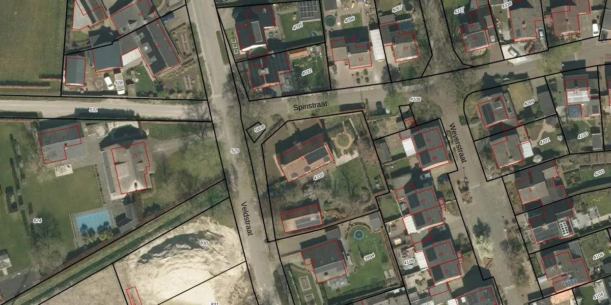 Spinstraat 13 is gelegen op kadastraal perceel SRY00D4335. Deze kadastrale aanduiding is uniek en wordt gebruikt door het Kadaster om eigendomsrechten en andere zakelijke rechten vast te leggen. Het perceel maakt onderdeel uit van de kadastrale gemeente Stramproy.