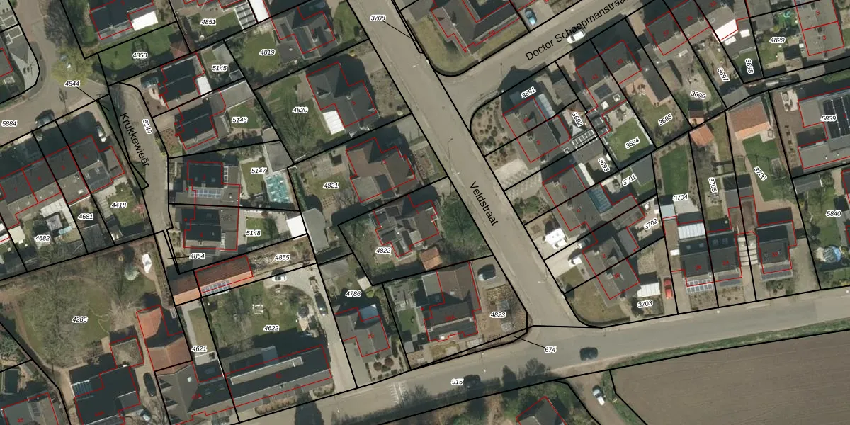 Het perceel waarop Veldstraat 1 staat heeft een oppervlakte van 535 m². Dit is een groot perceel. De perceeloppervlakte wordt geregistreerd door het Kadaster. Gedetailleerde informatie over de maten van dit perceel kunt u vinden in het rapport Kadastrale kaart met maatvoering van Veldstraat 1.