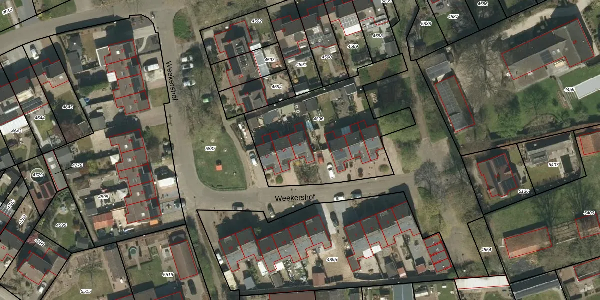 Weekershof 8 is gelegen op kadastraal perceel SRY00D4896. Deze kadastrale aanduiding is uniek en wordt gebruikt door het Kadaster om eigendomsrechten en andere zakelijke rechten vast te leggen. Het perceel maakt onderdeel uit van de kadastrale gemeente Stramproy.