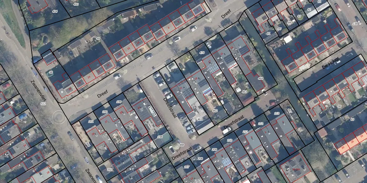 Gebruik de zoekbalk of klik op een perceel voor informatie over de adressen binnen dit perceel.