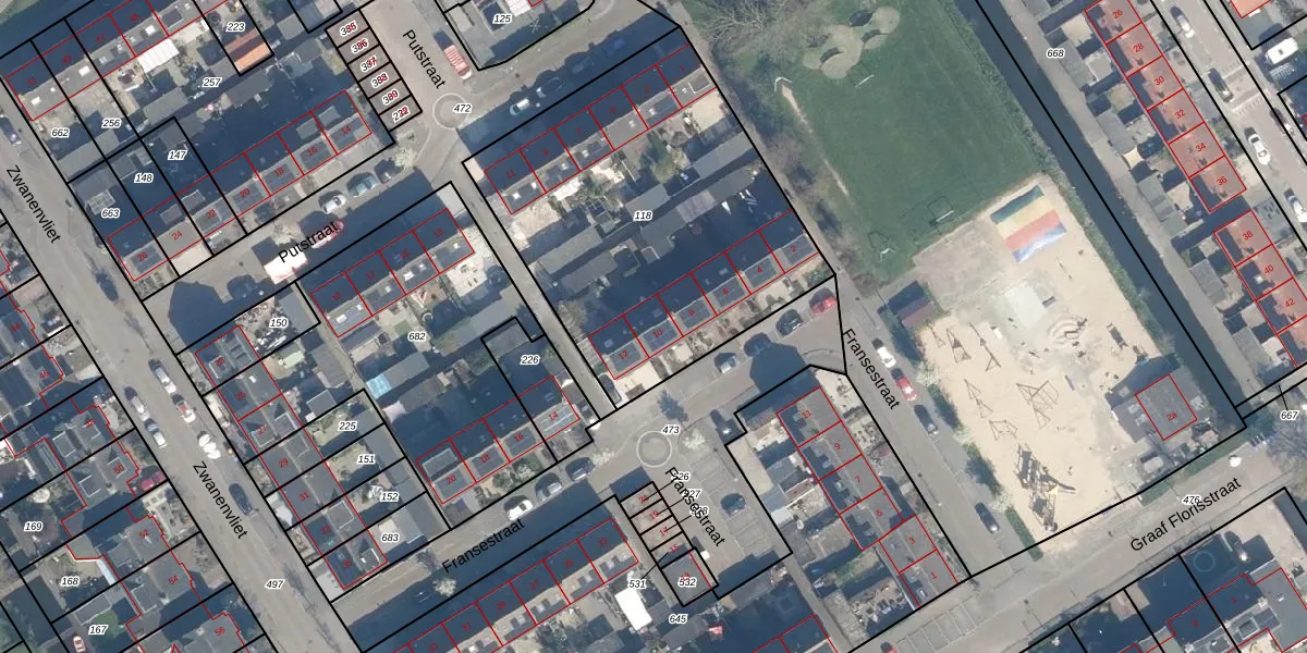 Het perceel waarop Fransestraat 10 staat heeft een oppervlakte van 1759 m². Dit is een zeer groot perceel. De perceeloppervlakte wordt geregistreerd door het Kadaster. Gedetailleerde informatie over de maten van dit perceel kunt u vinden in het rapport Kadastrale kaart met maatvoering van Fransestraat 10.
