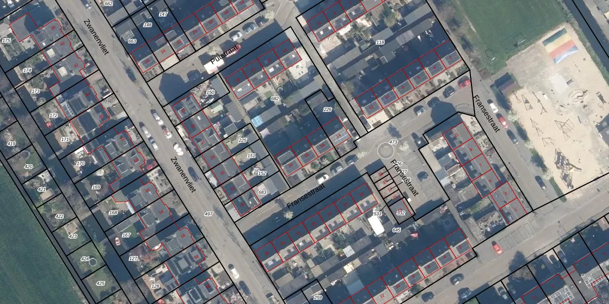 Het perceel waarop Fransestraat 18 staat heeft een oppervlakte van 1357 m². Dit is een zeer groot perceel. De perceeloppervlakte wordt geregistreerd door het Kadaster. Gedetailleerde informatie over de maten van dit perceel kunt u vinden in het rapport Kadastrale kaart met maatvoering van Fransestraat 18.