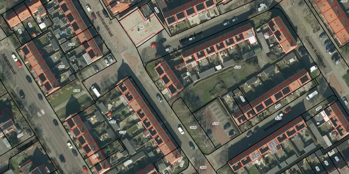 Het perceel waarop Bernhardstraat 65 staat heeft een oppervlakte van 3635 m². Dit is een zeer groot perceel. De perceeloppervlakte wordt geregistreerd door het Kadaster. Gedetailleerde informatie over de maten van dit perceel kunt u vinden in het rapport Kadastrale kaart met maatvoering van Bernhardstraat 65.