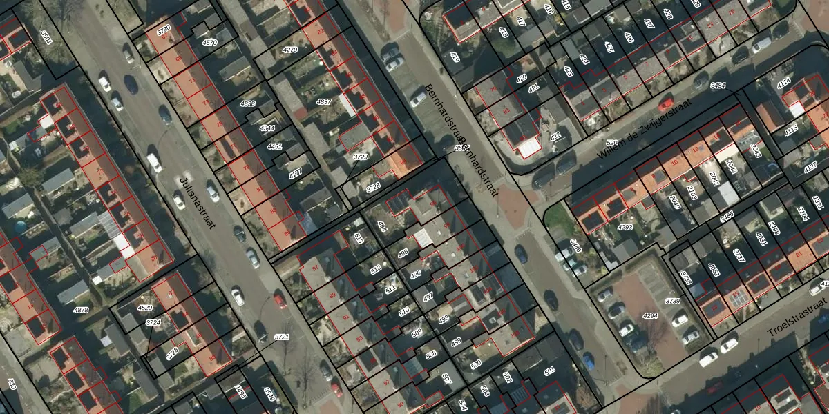 Gebruik de zoekbalk of klik op een perceel voor informatie over de adressen binnen dit perceel.