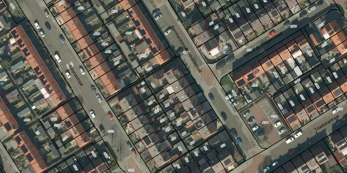Gebruik de zoekbalk of klik op een perceel voor informatie over de adressen binnen dit perceel.