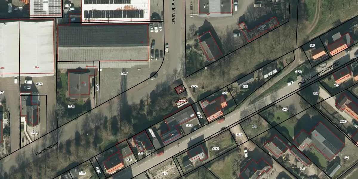 Het perceel waarop Handelstraat 23-a staat heeft een oppervlakte van 20 m². Dit is een klein perceel. De perceeloppervlakte wordt geregistreerd door het Kadaster. Gedetailleerde informatie over de maten van dit perceel kunt u vinden in het rapport Kadastrale kaart met maatvoering van Handelstraat 23-a.