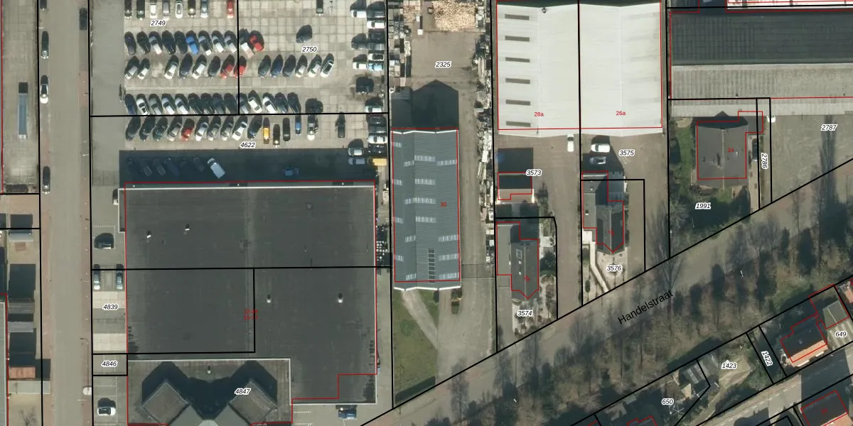 Het perceel waarop Handelstraat 30 staat heeft een oppervlakte van 2195 m². Dit is een zeer groot perceel. De perceeloppervlakte wordt geregistreerd door het Kadaster. Gedetailleerde informatie over de maten van dit perceel kunt u vinden in het rapport Kadastrale kaart met maatvoering van Handelstraat 30.