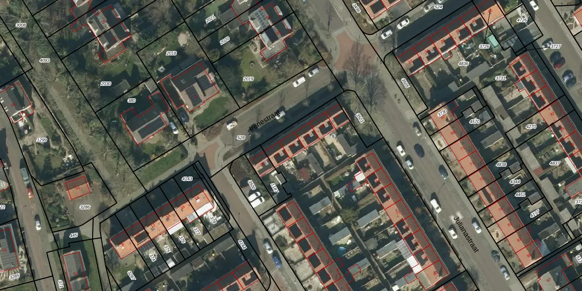 Het perceel waarop Irenestraat 24 staat heeft een oppervlakte van 4540 m². Dit is een zeer groot perceel. De perceeloppervlakte wordt geregistreerd door het Kadaster. Gedetailleerde informatie over de maten van dit perceel kunt u vinden in het rapport Kadastrale kaart met maatvoering van Irenestraat 24.