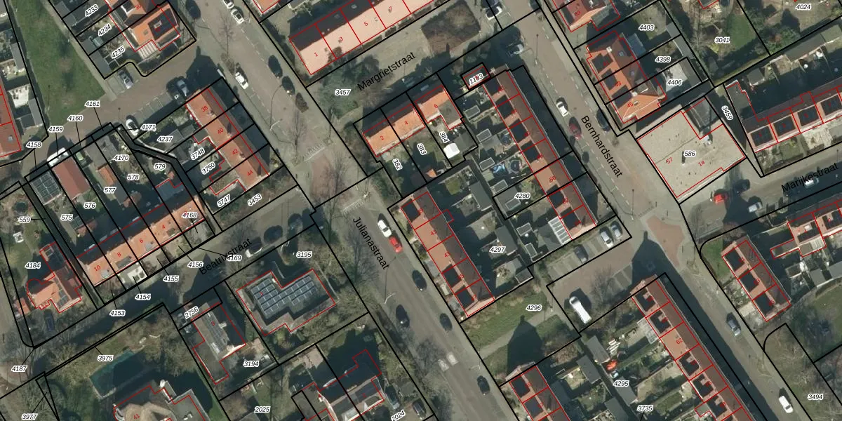 Het perceel waarop Julianastraat 39 staat heeft een oppervlakte van 1505 m². Dit is een zeer groot perceel. De perceeloppervlakte wordt geregistreerd door het Kadaster. Gedetailleerde informatie over de maten van dit perceel kunt u vinden in het rapport Kadastrale kaart met maatvoering van Julianastraat 39.