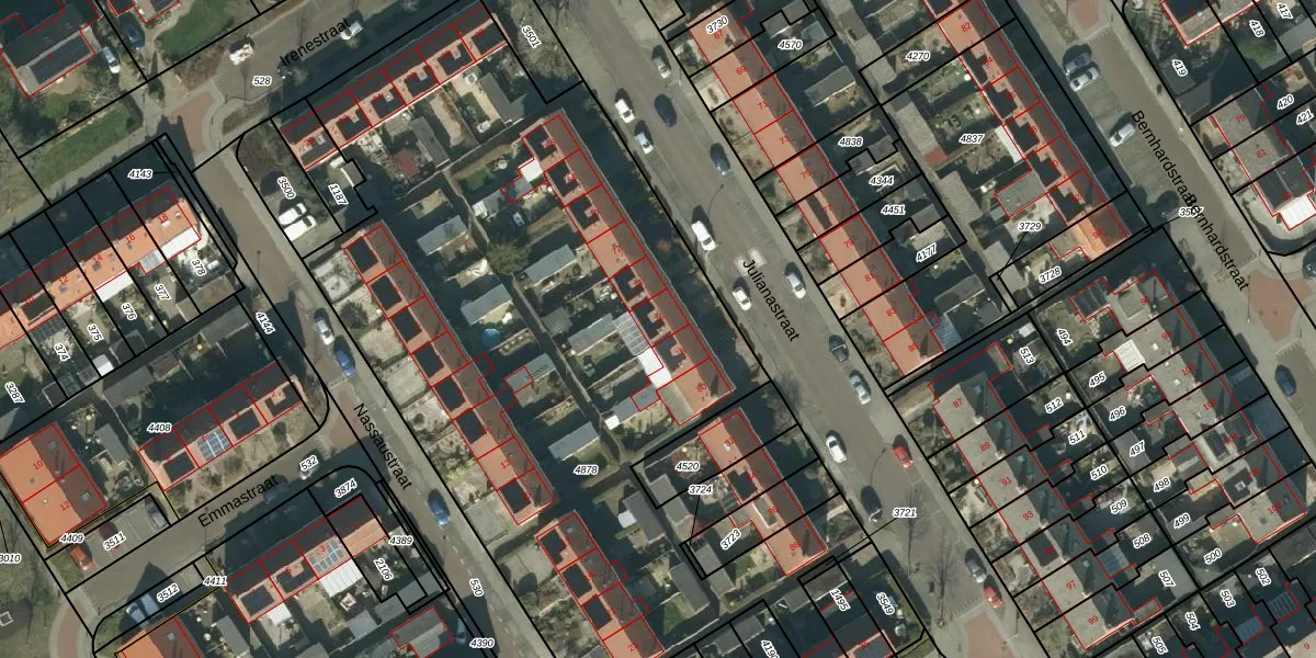 Het perceel waarop Julianastraat 76 staat heeft een oppervlakte van 4540 m². Dit is een zeer groot perceel. De perceeloppervlakte wordt geregistreerd door het Kadaster. Gedetailleerde informatie over de maten van dit perceel kunt u vinden in het rapport Kadastrale kaart met maatvoering van Julianastraat 76.