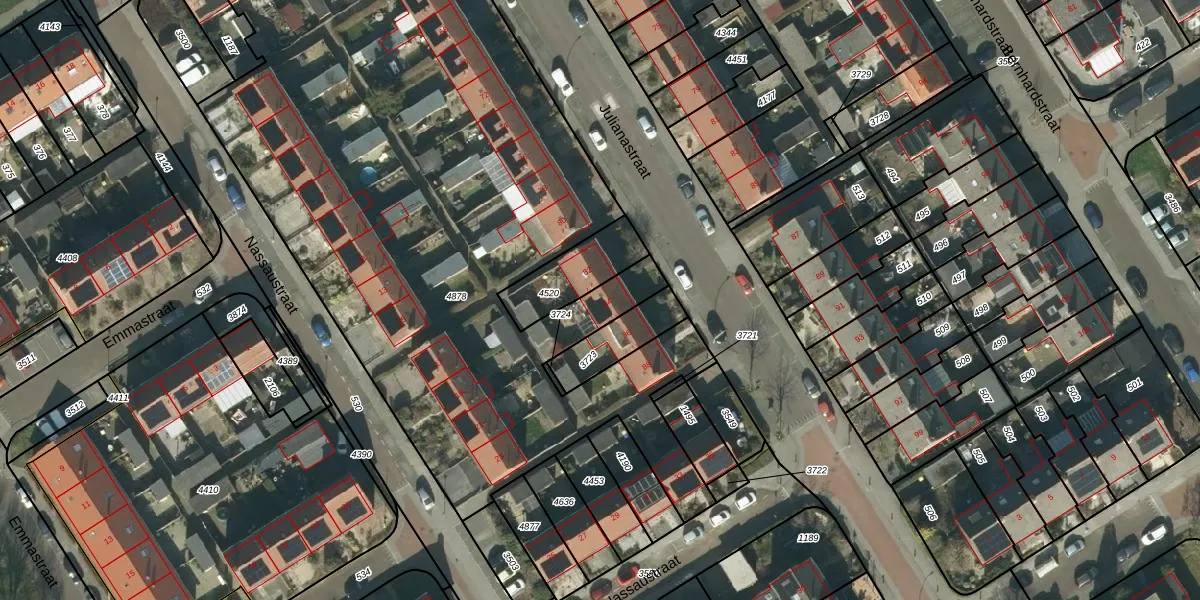 Het perceel waarop Julianastraat 84 staat heeft een oppervlakte van 4540 m². Dit is een zeer groot perceel. De perceeloppervlakte wordt geregistreerd door het Kadaster. Gedetailleerde informatie over de maten van dit perceel kunt u vinden in het rapport Kadastrale kaart met maatvoering van Julianastraat 84.