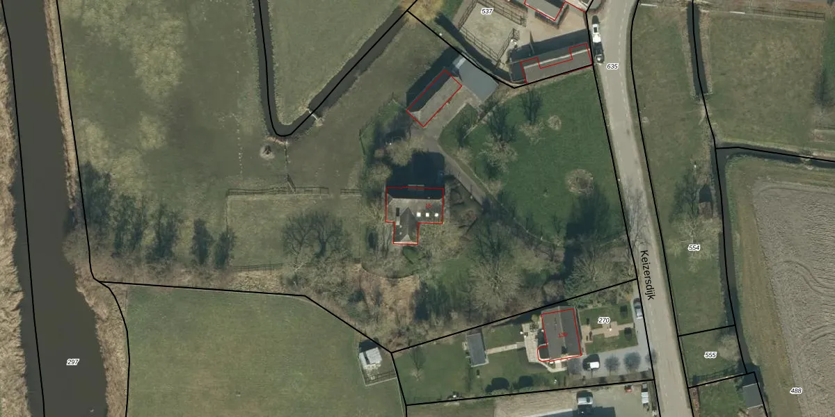 Het perceel waarop Keizersdijk 15 staat heeft een oppervlakte van 1,0 ha. Dit is een zeer groot perceel. De perceeloppervlakte wordt geregistreerd door het Kadaster. Gedetailleerde informatie over de maten van dit perceel kunt u vinden in het rapport Kadastrale kaart met maatvoering van Keizersdijk 15.