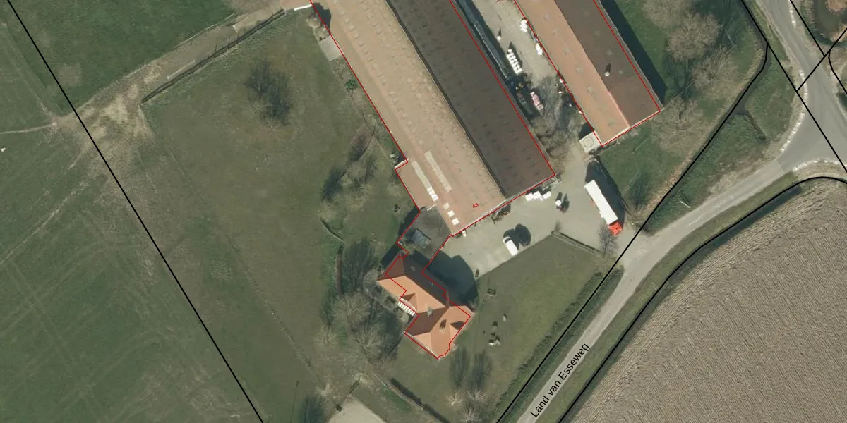 Het perceel waarop Land van Esseweg 4-a staat heeft een oppervlakte van 2,8 ha. Dit is een zeer groot perceel. De perceeloppervlakte wordt geregistreerd door het Kadaster. Gedetailleerde informatie over de maten van dit perceel kunt u vinden in het rapport Kadastrale kaart met maatvoering van Land van Esseweg 4-a.