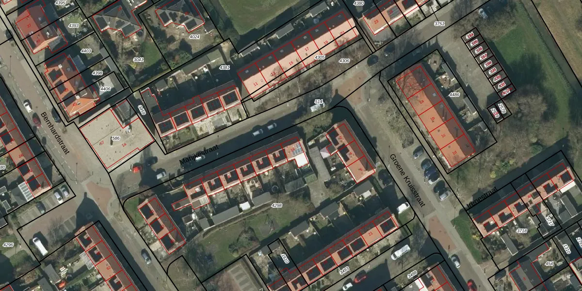 Het perceel waarop Marijkestraat 16 staat heeft een oppervlakte van 3635 m². Dit is een zeer groot perceel. De perceeloppervlakte wordt geregistreerd door het Kadaster. Gedetailleerde informatie over de maten van dit perceel kunt u vinden in het rapport Kadastrale kaart met maatvoering van Marijkestraat 16.