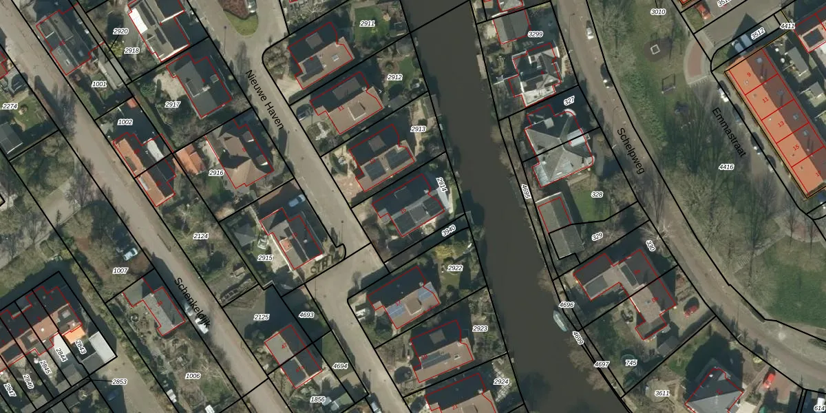 Het perceel waarop Nieuwe Haven 15 staat heeft een oppervlakte van 383 m². Dit is een groot perceel. De perceeloppervlakte wordt geregistreerd door het Kadaster. Gedetailleerde informatie over de maten van dit perceel kunt u vinden in het rapport Kadastrale kaart met maatvoering van Nieuwe Haven 15.