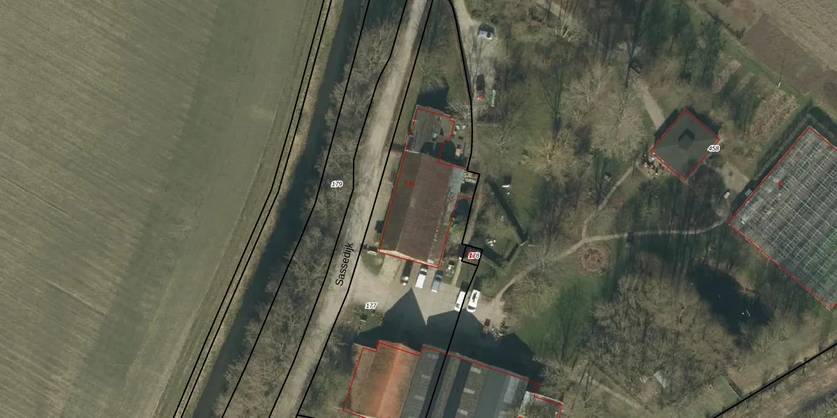 Het perceel waarop Sassedijk 8-b staat heeft een oppervlakte van 2245 m². Dit is een zeer groot perceel. De perceeloppervlakte wordt geregistreerd door het Kadaster. Gedetailleerde informatie over de maten van dit perceel kunt u vinden in het rapport Kadastrale kaart met maatvoering van Sassedijk 8-b.