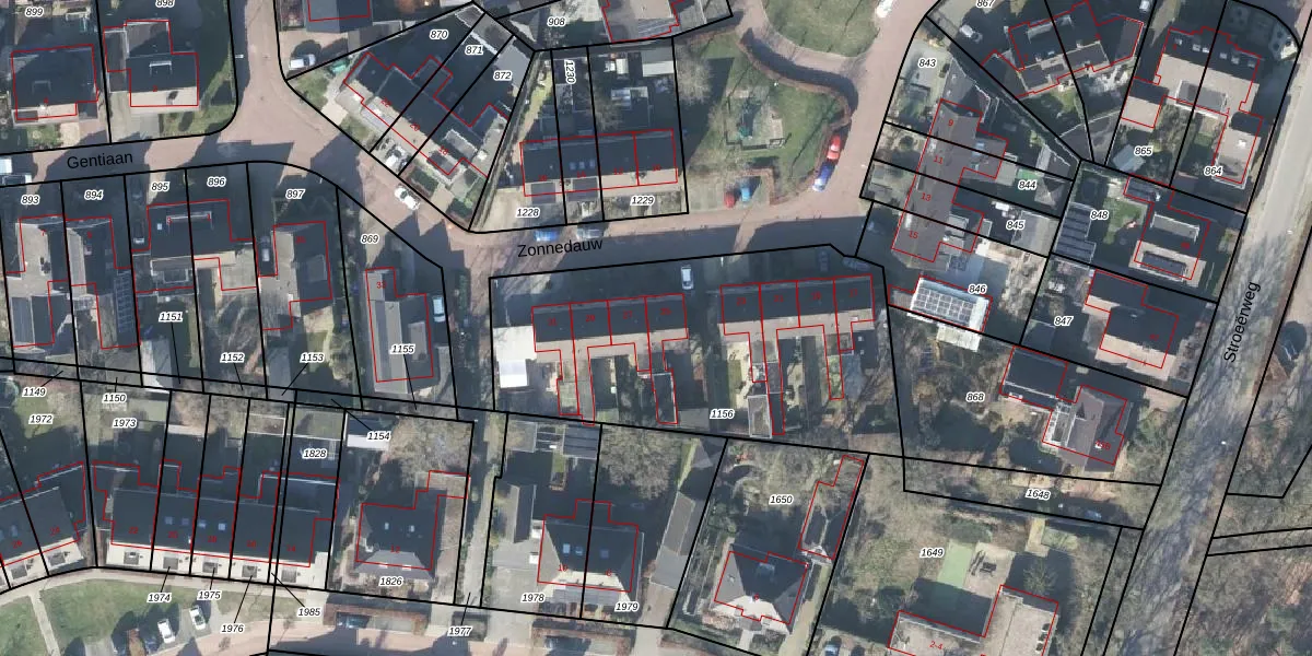 Het perceel waarop Zonnedauw 25 staat heeft een oppervlakte van 1600 m². Dit is een zeer groot perceel. De perceeloppervlakte wordt geregistreerd door het Kadaster. Gedetailleerde informatie over de maten van dit perceel kunt u vinden in het rapport Kadastrale kaart met maatvoering van Zonnedauw 25.