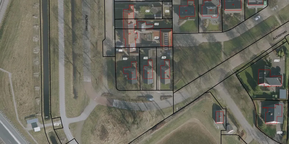 Het perceel waarop Achterwei 46 staat heeft een oppervlakte van 345 m². Dit is een groot perceel. De perceeloppervlakte wordt geregistreerd door het Kadaster. Gedetailleerde informatie over de maten van dit perceel kunt u vinden in het rapport Kadastrale kaart met maatvoering van Achterwei 46.