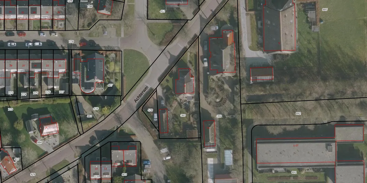 Het perceel waarop Achterwei 9 staat heeft een oppervlakte van 960 m². Dit is een groot perceel. De perceeloppervlakte wordt geregistreerd door het Kadaster. Gedetailleerde informatie over de maten van dit perceel kunt u vinden in het rapport Kadastrale kaart met maatvoering van Achterwei 9.
