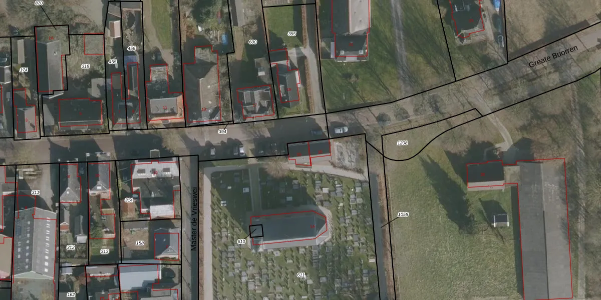 Het perceel waarop Greate Buorren 16 staat heeft een oppervlakte van 3402 m². Dit is een zeer groot perceel. De perceeloppervlakte wordt geregistreerd door het Kadaster. Gedetailleerde informatie over de maten van dit perceel kunt u vinden in het rapport Kadastrale kaart met maatvoering van Greate Buorren 16.
