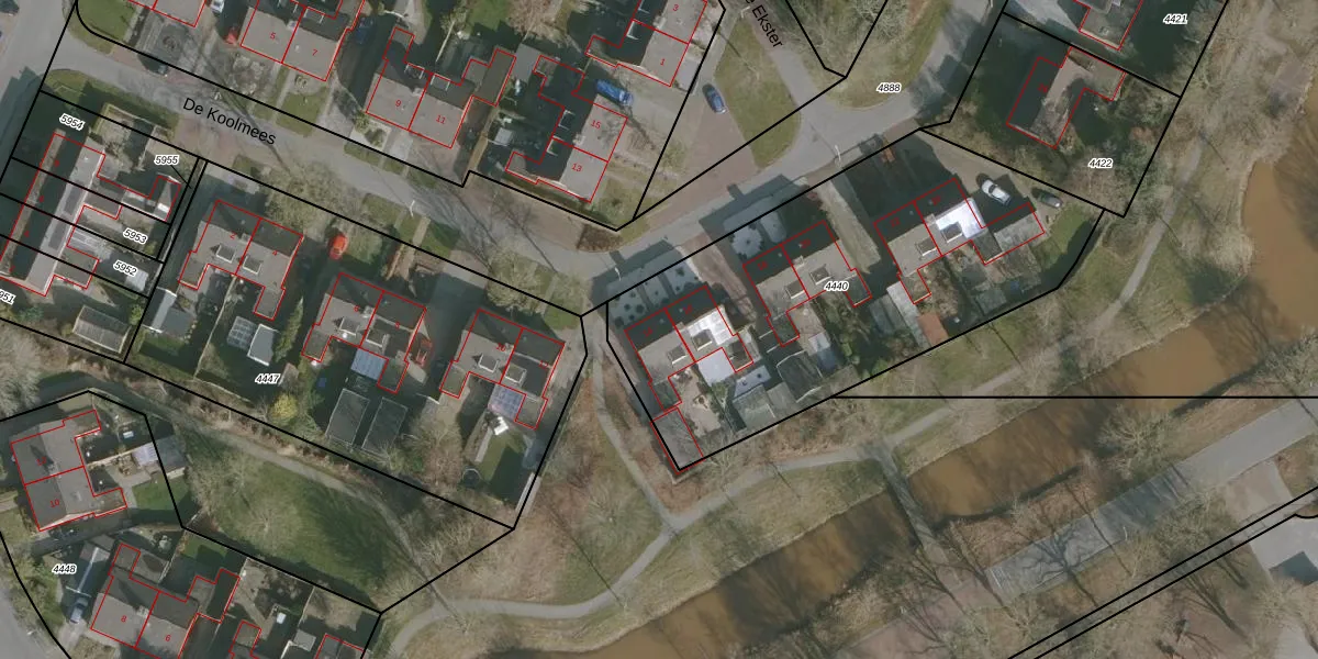 Het perceel waarop De Koolmees 14 staat heeft een oppervlakte van 1978 m². Dit is een zeer groot perceel. De perceeloppervlakte wordt geregistreerd door het Kadaster. Gedetailleerde informatie over de maten van dit perceel kunt u vinden in het rapport Kadastrale kaart met maatvoering van De Koolmees 14.