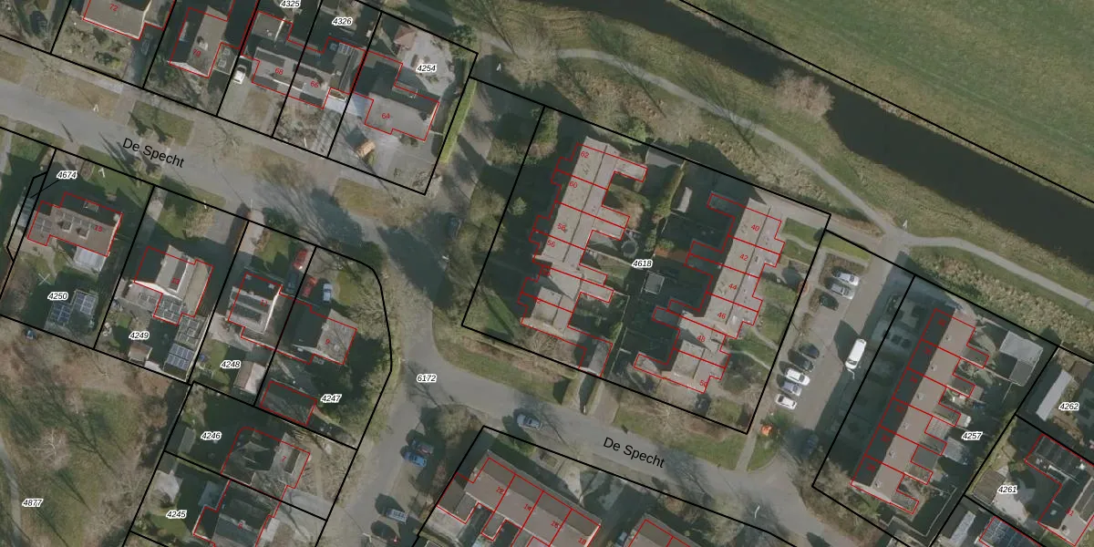 Het perceel waarop De Specht 54 staat heeft een oppervlakte van 2398 m². Dit is een zeer groot perceel. De perceeloppervlakte wordt geregistreerd door het Kadaster. Gedetailleerde informatie over de maten van dit perceel kunt u vinden in het rapport Kadastrale kaart met maatvoering van De Specht 54.