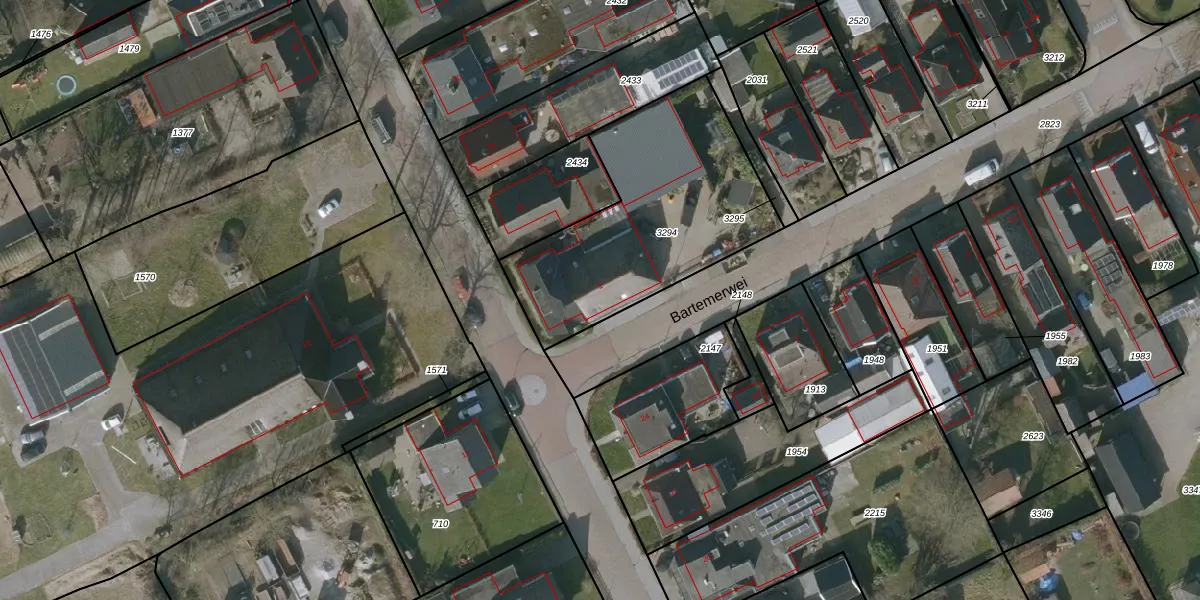 Het perceel waarop Bartemerwei 1 staat heeft een oppervlakte van 1065 m². Dit is een zeer groot perceel. De perceeloppervlakte wordt geregistreerd door het Kadaster. Gedetailleerde informatie over de maten van dit perceel kunt u vinden in het rapport Kadastrale kaart met maatvoering van Bartemerwei 1.