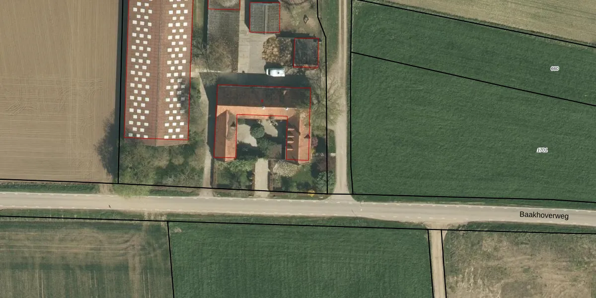 Het perceel waarop Baakhoverweg 6 staat heeft een oppervlakte van 9090 m². Dit is een zeer groot perceel. De perceeloppervlakte wordt geregistreerd door het Kadaster. Gedetailleerde informatie over de maten van dit perceel kunt u vinden in het rapport Kadastrale kaart met maatvoering van Baakhoverweg 6.