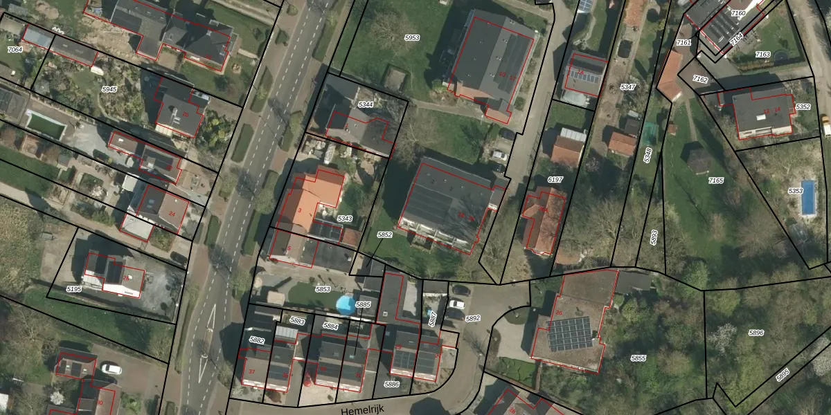 Het perceel waarop Hemelrijk 25 staat heeft een oppervlakte van 4420 m². Dit is een zeer groot perceel. De perceeloppervlakte wordt geregistreerd door het Kadaster. Gedetailleerde informatie over de maten van dit perceel kunt u vinden in het rapport Kadastrale kaart met maatvoering van Hemelrijk 25.