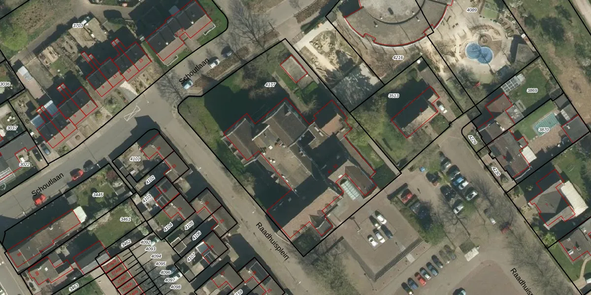 Het perceel waarop Raadhuisplein 46 staat heeft een oppervlakte van 2760 m². Dit is een zeer groot perceel. De perceeloppervlakte wordt geregistreerd door het Kadaster. Gedetailleerde informatie over de maten van dit perceel kunt u vinden in het rapport Kadastrale kaart met maatvoering van Raadhuisplein 46.