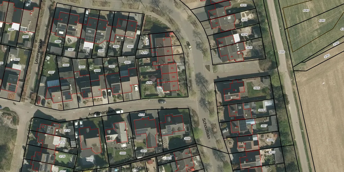 Schoutlaan 87 is gelegen op kadastraal perceel STR01F4258. Deze kadastrale aanduiding is uniek en wordt gebruikt door het Kadaster om eigendomsrechten en andere zakelijke rechten vast te leggen. Het perceel maakt onderdeel uit van de kadastrale gemeente Susteren.
