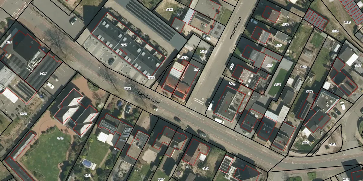 Het perceel waarop Tiendschuur 10 staat heeft een oppervlakte van 227 m². Dit is een middelgroot perceel. De perceeloppervlakte wordt geregistreerd door het Kadaster. Gedetailleerde informatie over de maten van dit perceel kunt u vinden in het rapport Kadastrale kaart met maatvoering van Tiendschuur 10.