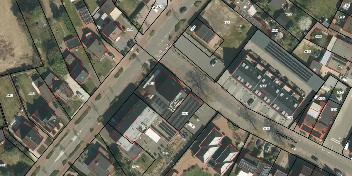 Tiendschuur 9 is gelegen op kadastraal perceel STR01D3412. Deze kadastrale aanduiding is uniek en wordt gebruikt door het Kadaster om eigendomsrechten en andere zakelijke rechten vast te leggen. Het perceel maakt onderdeel uit van de kadastrale gemeente Susteren.