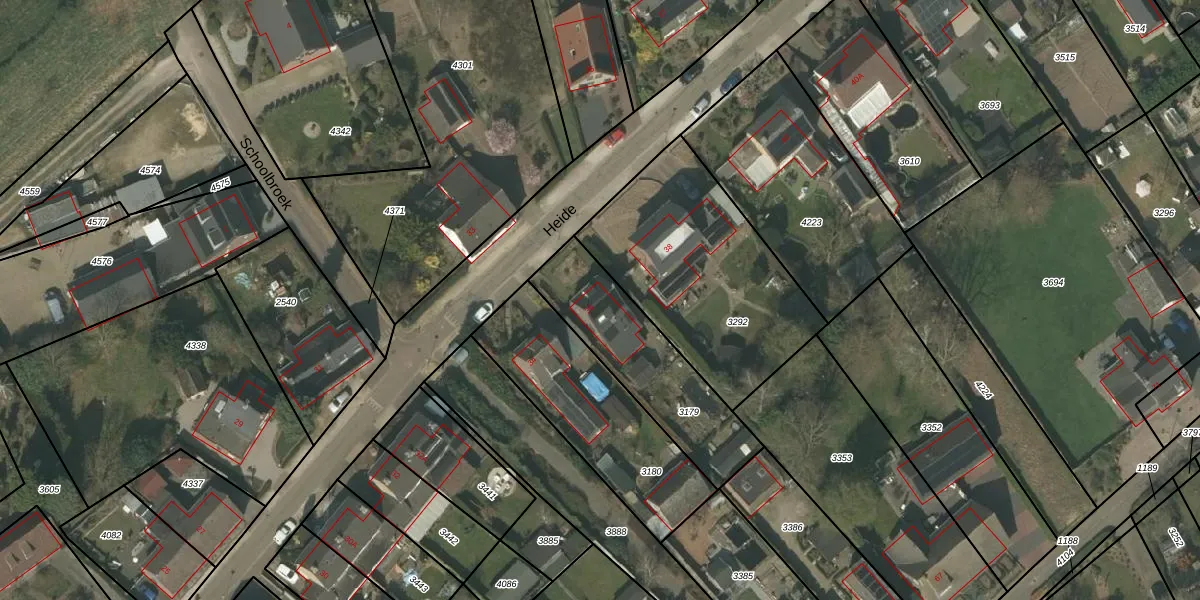Het perceel waarop Heide 36 staat heeft een oppervlakte van 490 m². Dit is een groot perceel. De perceeloppervlakte wordt geregistreerd door het Kadaster. Gedetailleerde informatie over de maten van dit perceel kunt u vinden in het rapport Kadastrale kaart met maatvoering van Heide 36.
