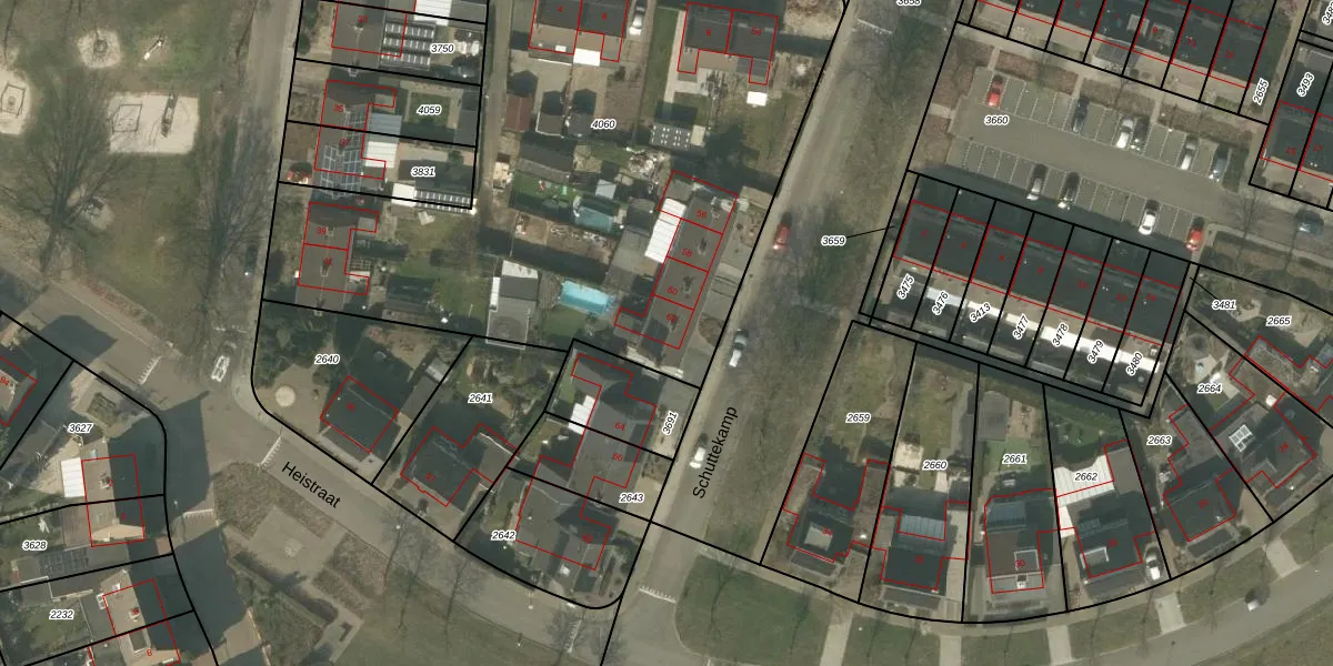 Het perceel waarop Schuttekamp 62 staat heeft een oppervlakte van 3315 m². Dit is een zeer groot perceel. De perceeloppervlakte wordt geregistreerd door het Kadaster. Gedetailleerde informatie over de maten van dit perceel kunt u vinden in het rapport Kadastrale kaart met maatvoering van Schuttekamp 62.