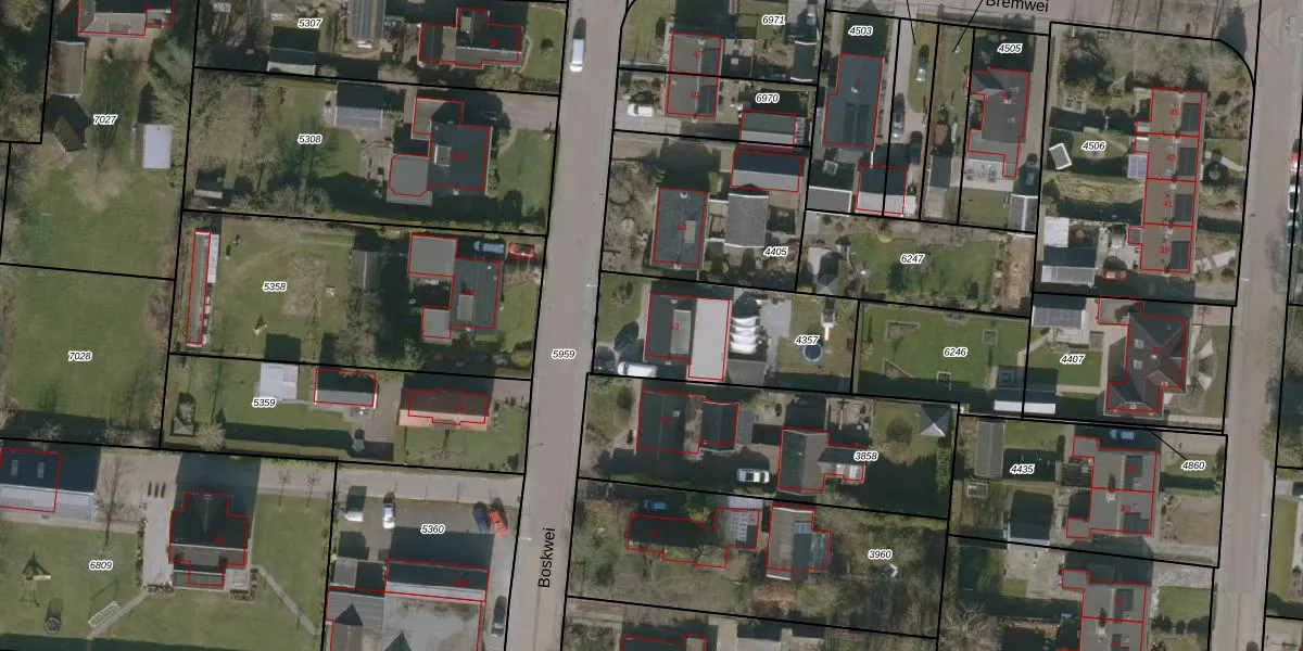 Het perceel waarop Boskwei 53 staat heeft een oppervlakte van 622 m². Dit is een groot perceel. De perceeloppervlakte wordt geregistreerd door het Kadaster. Gedetailleerde informatie over de maten van dit perceel kunt u vinden in het rapport Kadastrale kaart met maatvoering van Boskwei 53.