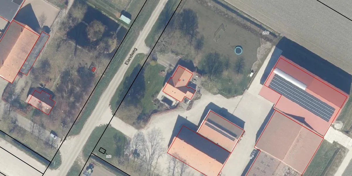 Het perceel waarop Elandweg 13 staat heeft een oppervlakte van 2,0 ha. Dit is een zeer groot perceel. De perceeloppervlakte wordt geregistreerd door het Kadaster. Gedetailleerde informatie over de maten van dit perceel kunt u vinden in het rapport Kadastrale kaart met maatvoering van Elandweg 13.