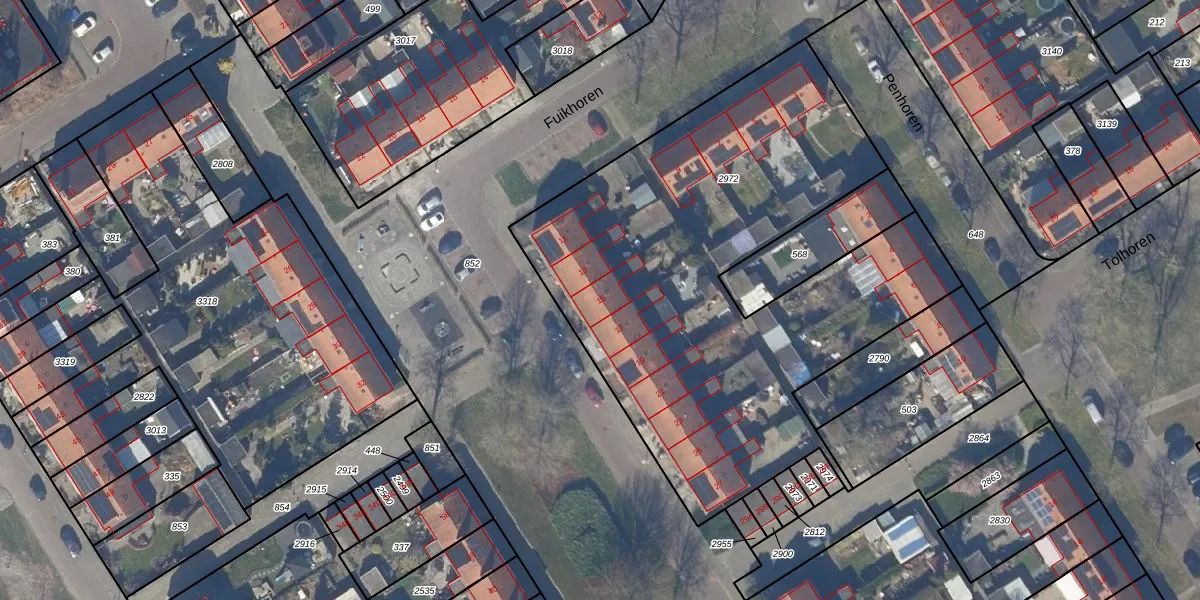 Het perceel waarop Fuikhoren 15 staat heeft een oppervlakte van 2841 m². Dit is een zeer groot perceel. De perceeloppervlakte wordt geregistreerd door het Kadaster. Gedetailleerde informatie over de maten van dit perceel kunt u vinden in het rapport Kadastrale kaart met maatvoering van Fuikhoren 15.