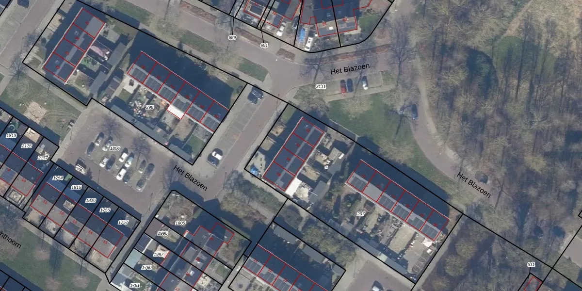 Het perceel waarop Het Blazoen 64 staat heeft een oppervlakte van 2043 m². Dit is een zeer groot perceel. De perceeloppervlakte wordt geregistreerd door het Kadaster. Gedetailleerde informatie over de maten van dit perceel kunt u vinden in het rapport Kadastrale kaart met maatvoering van Het Blazoen 64.